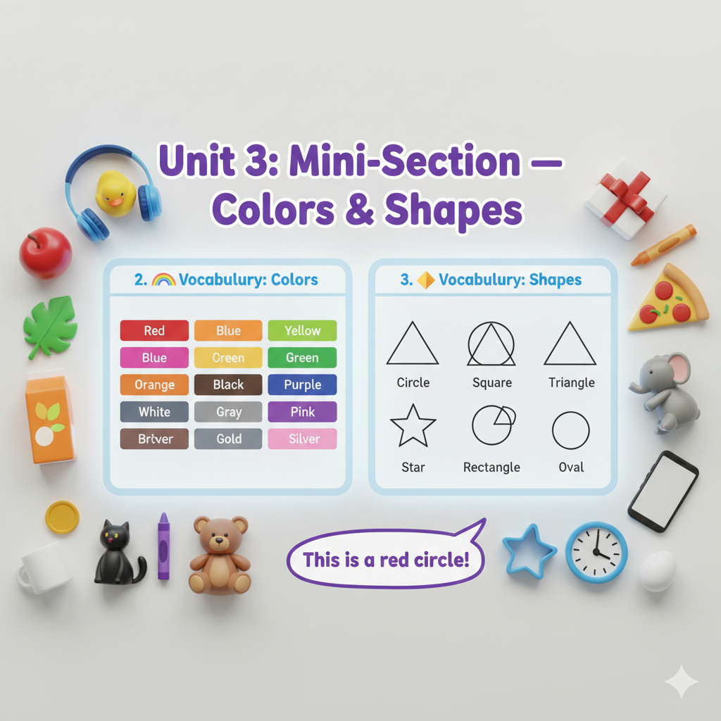 This section introduces basic vocabulary for colors and geometric shapes, helping you describe everyday objects and places more clearly.